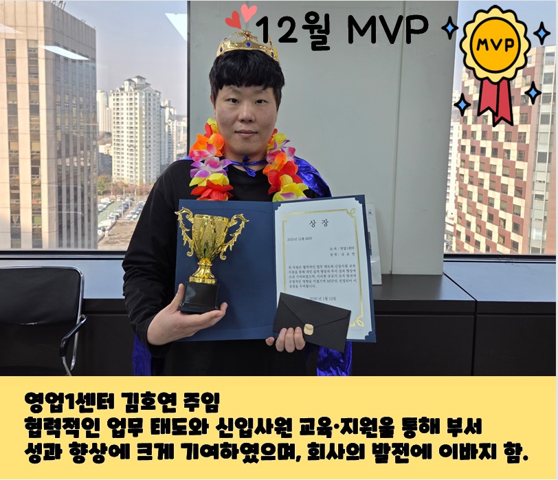 2025-12 동양 MVP 페이지 정보 작성자 관리자 댓글 0건 조회 2,564회 작성일 26-01-13 09:05 본문 . 목록 이전글2026년 한국대부금융협회 우수직원 표창장 수상 26.01.23 다음글[업무 혁신 아이디어 우수직원 시상] 26.01.12
